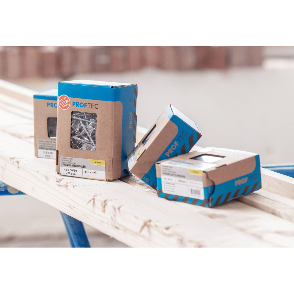Spaanplaat schroeven van het merk Proftec. Deze schroeven onderscheiden zich door het de grove spoed, voor snel indraaien van de schroef. Tevens heeft de schroef een scherpe snijpunt en een waxlaag, alles om er voor te zorgen dat de schroef gemakkelijk indraait, zelfs zonder voorboren. De schroeven met een diameter van 4.0 en 5.0 mm hebben een Torx-20 aansluiting, wat het werkgemak vergroot omdat u niet meer van bit hoeft te wisselen. Een bijkomend voordeel is dat elk doosje een gratis bit bevat, zodat u nooit meer hoeft te zoeken naar een passende bit! De schroeven zijn leverbaar in deeldraad en voldraad.